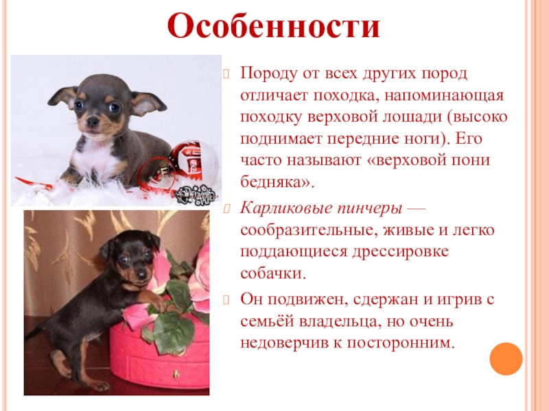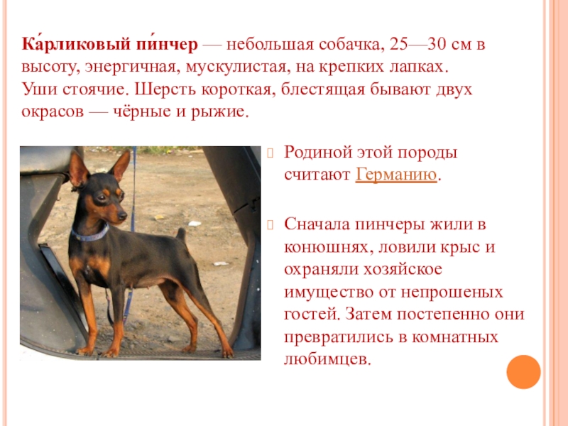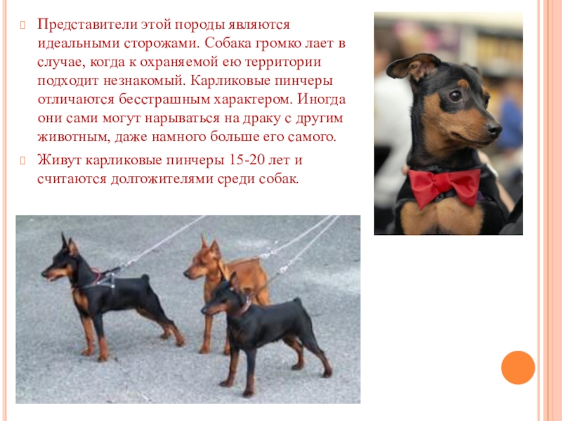 Сначала пинчеры жили в конюшнях, ловили крыс и охраняли хозяйское имущество от непрошеных гостей. Затем постепенно они превратились в комнатных любимцев.