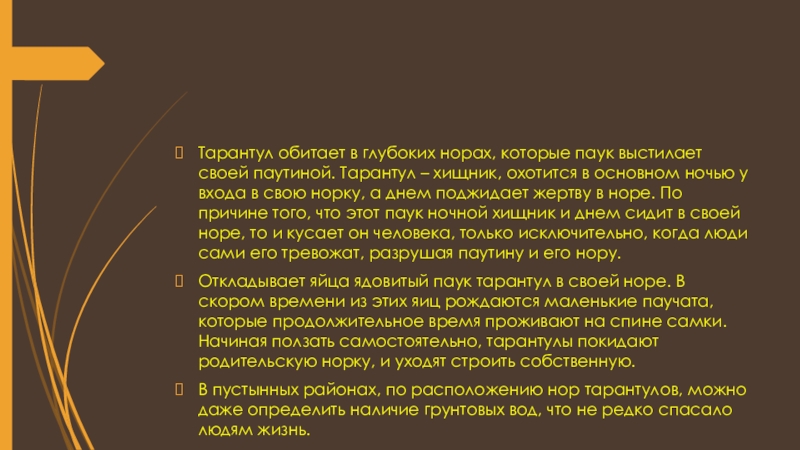 Слайд 4Тарантул обитает в глубоких норах, которые паук выстилает своей паутиной. Тарантул