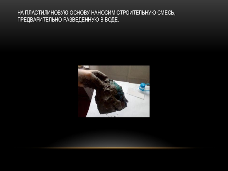 Слайд 30На пластилиновую основу наносим строительную смесь, предварительно разведенную в воде.