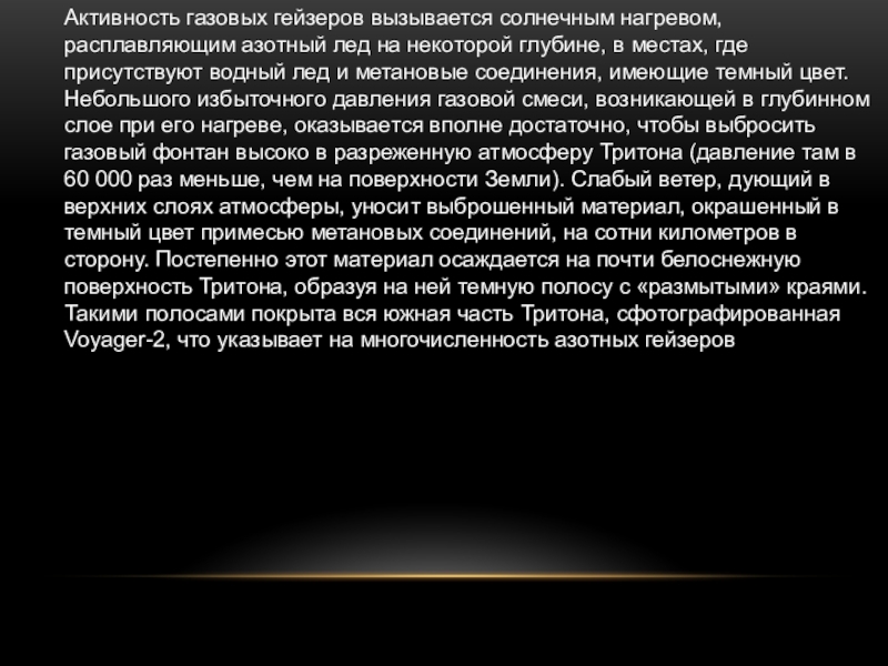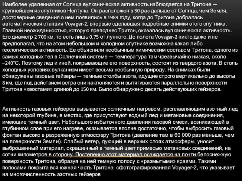 крупнейшем из спутников Нептуна. Он расположен в 30 раз дальше от Солнца, чем Земля, достоверные сведения о нем появились в 1989 году, когда до Тритона добралась автоматическая станция Voyager-2, впервые сделавшая подробные снимки этого спутника. Главной неожиданностью, которую преподнес Тритон, оказалась вулканическая активность. Его диаметр 2 700 км, то есть лишь 0,75 от лунного. До полета Voyager-2 никто даже и не предполагал, что на этом небольшом и холодном спутнике возможна какая-либо геологическая активность. Ее объяснили необычным химическим составом Тритона, одного из самых холодных тел в Солнечной системе — температура там чрезвычайно низкая, около –240°С. Поэтому лед и иней, покрывающие его поверхность, состоят из твердого азота. В столь холодных условиях вулканизм имеет весьма необычную природу. На снимках были обнаружены газовые гейзеры — темные столбы азота, идущие строго вертикально до высоты 8 км, где под действием ветра они наклоняются и вытягиваются параллельно поверхности Тритона «хвостами» длиной до 150 км. Было обнаружено десять действующих гейзеров. Гейзеры эти – черные, так как вместе с азотом из недр извергается угольная пыль и частицы породы.