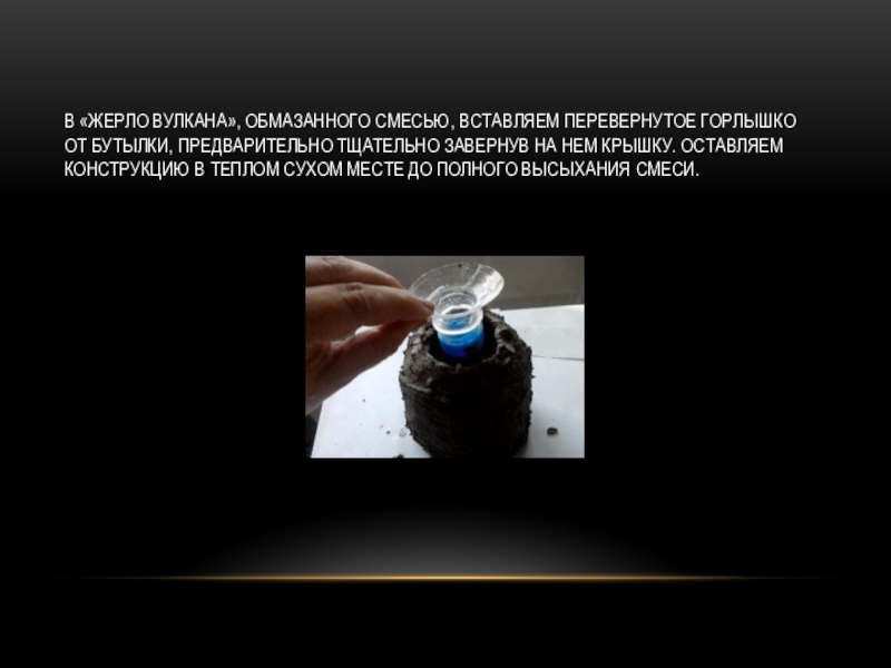 Слайд 31В «жерло вулкана», обмазанного смесью, вставляем перевернутое горлышко от бутылки, предварительно
