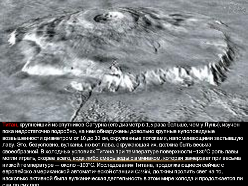 чем у Луны), изучен пока недостаточно подробно, на нем обнаружены довольно крупные куполовидные возвышенности диаметром от 10 до 30 км, окруженные потоками, напоминающими застывшую лаву. Это, безусловно, вулканы, но вот лава, окружающая их, должна быть весьма своеобразной. В холодных условиях Титана при температуре поверхности –180°С роль лавы могли играть, скорее всего, вода либо смесь воды с аммиаком, которая замерзает при весьма низкой температуре — около –100°С. Исследования Титана, продолжающиеся сейчас с европейско-американской автоматической станции Cassini, должны пролить свет на то, насколько активной была вулканическая деятельность в этом мире холода и продолжается ли она до сих пор.