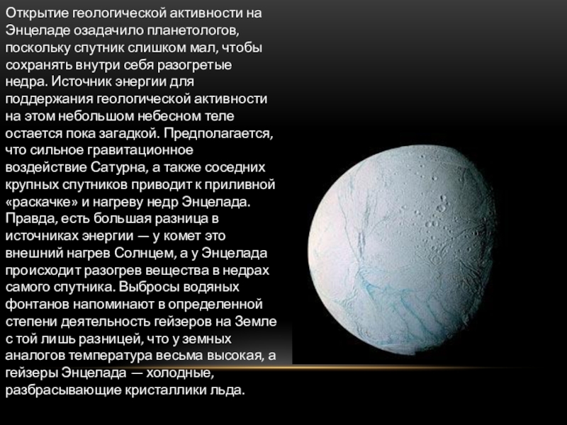 Слайд 12Открытие геологической активности на Энцеладе озадачило планетологов, поскольку спутник слишком мал,