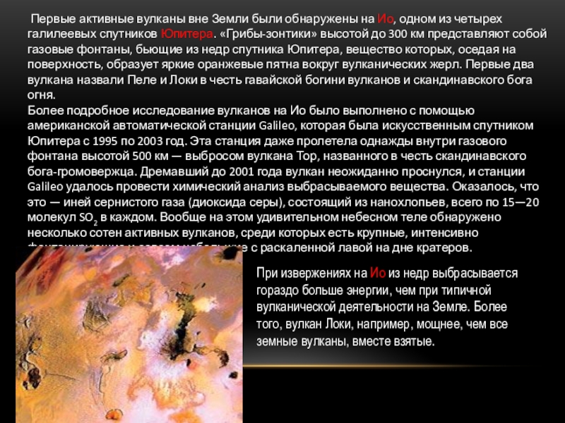 из четырех галилеевых спутников Юпитера. «Грибы-зонтики» высотой до 300 км представляют собой газовые фонтаны, бьющие из недр спутника Юпитера, вещество которых, оседая на поверхность, образует яркие оранжевые пятна вокруг вулканических жерл. Первые два вулкана назвали Пеле и Локи в честь гавайской богини вулканов и скандинавского бога огня.
