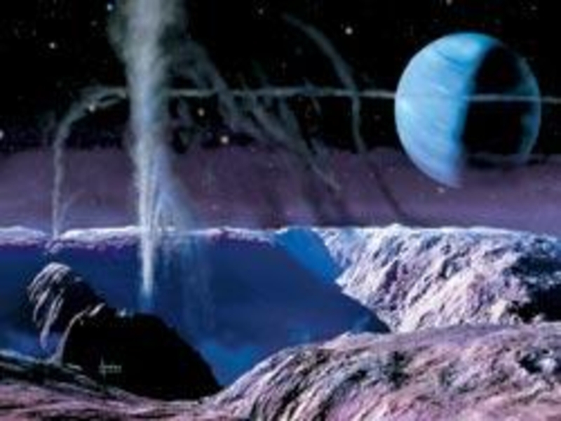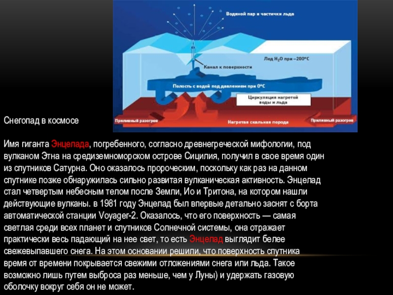Энцеладе. Процесс их извержения происходил «непривычным» образом: из «нутра» ледяного объекта на сотни километров вверх выбрасывались фонтаны воды, которая тут же становилась холодным туманом из ледяных кристаллов.