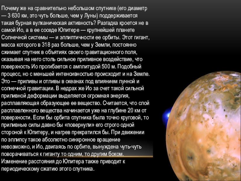 Слайд 8Почему же на сравнительно небольшом спутнике (его диаметр — 3 630