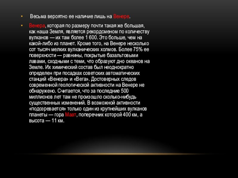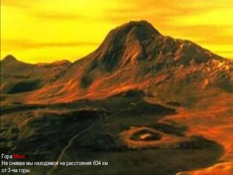 размеру почти такая же большая, как наша Земля, является рекордсменом по количеству вулканов — их там более 1 600. Это больше, чем на какой-либо из планет. Кроме того, на Венере несколько сот тысяч мелких вулканических холмов. Более 75% ее поверхности — равнины, покрытые базальтовыми лавами, сходными с теми, что образуют дно океанов на Земле. Их химический состав был неоднократно определен при посадках советских автоматических станций «Венера» и «Вега». Достоверных следов современной геологической активности на Венере не обнаружено. Считается, что за последние 500 миллионов лет там не произошло сколько-нибудь существенных изменений. В возможной активности «подозревается» только один из крупнейших вулканов планеты — гора Маат, поперечник которой 400 км, а высота — 11 км.