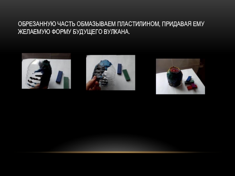 Слайд 29Обрезанную часть обмазываем пластилином, придавая ему желаемую форму будущего вулкана.