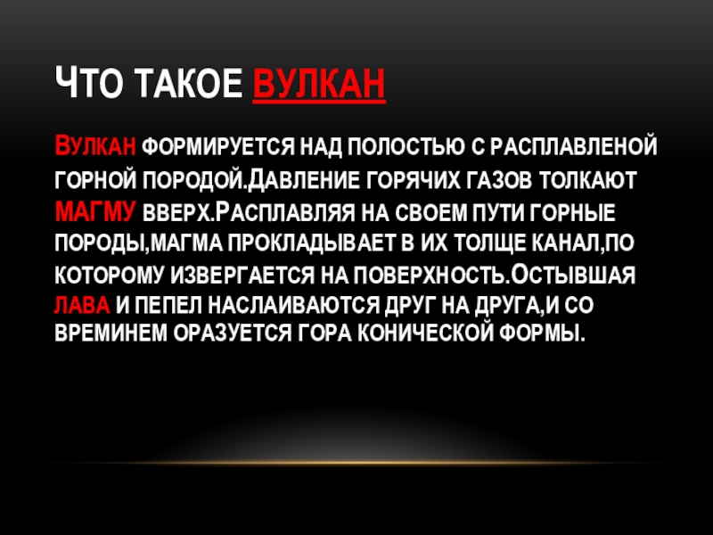 ВУЛКАН ФОРМИРУЕТСЯ НАД ПОЛОСТЬЮ С РАСПЛАВЛЕНОЙ ГОРНОЙ ПОРОДОЙ.ДАВЛЕНИЕ ГОРЯЧИХ