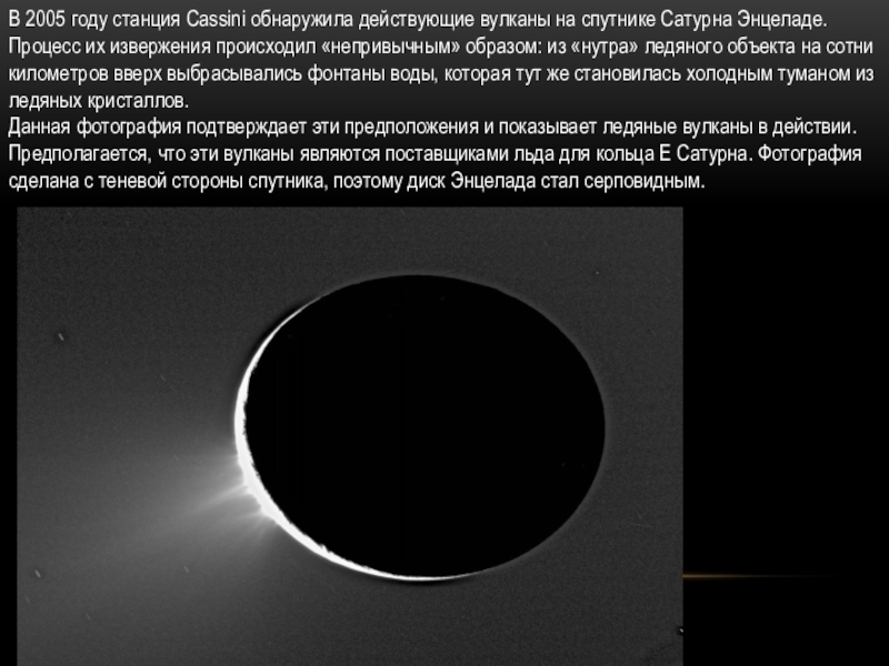 Слайд 9В 2005 году станция Cassini обнаружила действующие вулканы на спутнике Сатурна