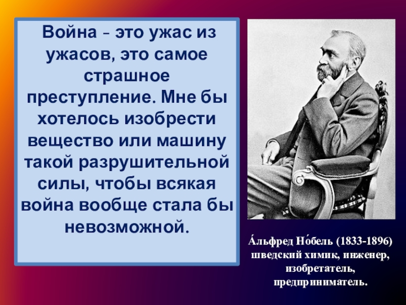 А́льфред Но́бель (1833-1896)шведский химик, инженер, изобретатель, предприниматель.