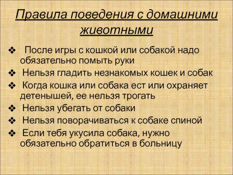 Правила поведения с домашними животными После игры с кошкой или собакой надо обязательно помыть руки Нельзя гладить