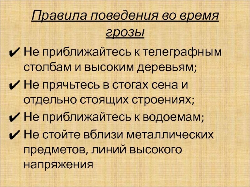 Правила поведения во время грозыНе приближайтесь к телеграфным столбам и высоким деревьям;Не прячьтесь в стогах сена и