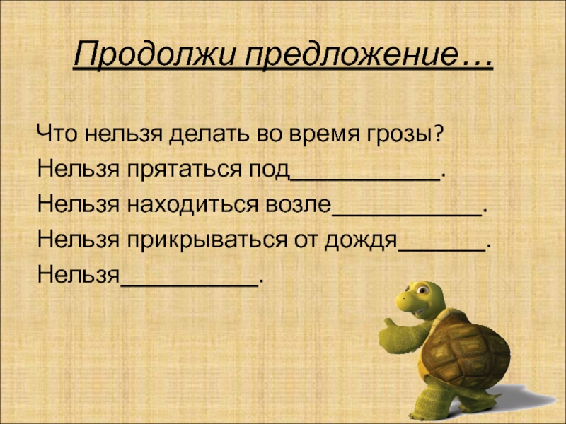 Продолжи предложение…Что нельзя делать во время грозы? Нельзя прятаться под____________.Нельзя находиться возле____________.Нельзя прикрываться от дождя_______.Нельзя___________.
