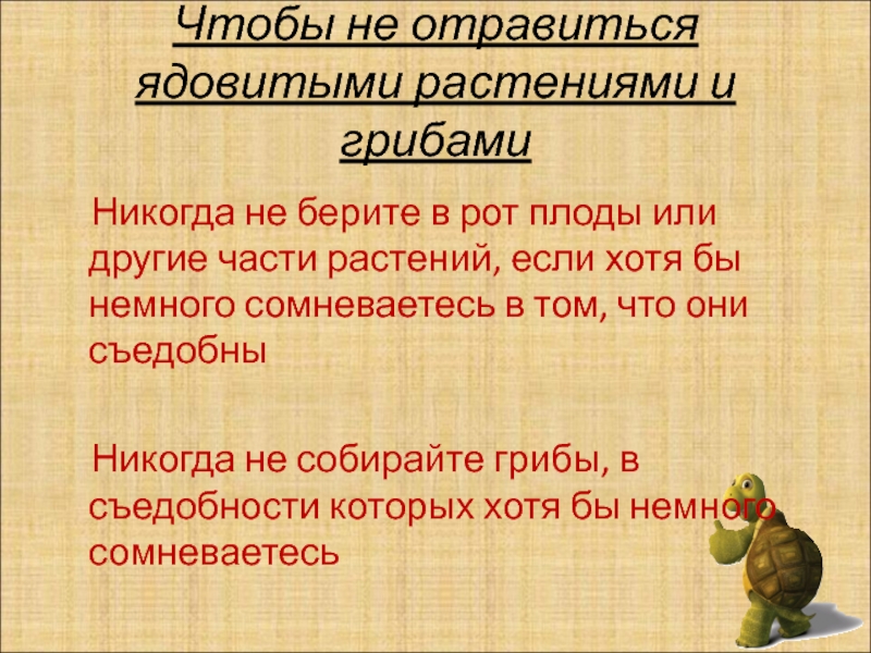 Чтобы не отравиться ядовитыми растениями и грибами  Никогда не берите в рот плоды или другие части