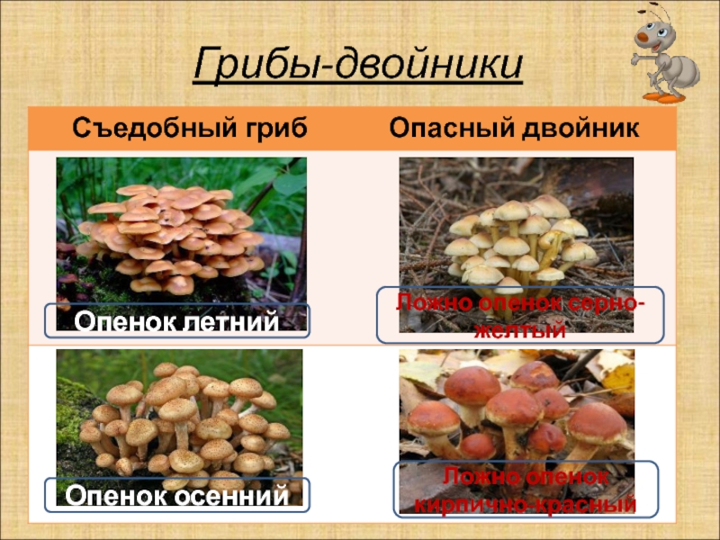 Грибы-двойникиЛожно опенок серно-желтыйОпенок летнийЛожно опенок кирпично-красныйОпенок осенний