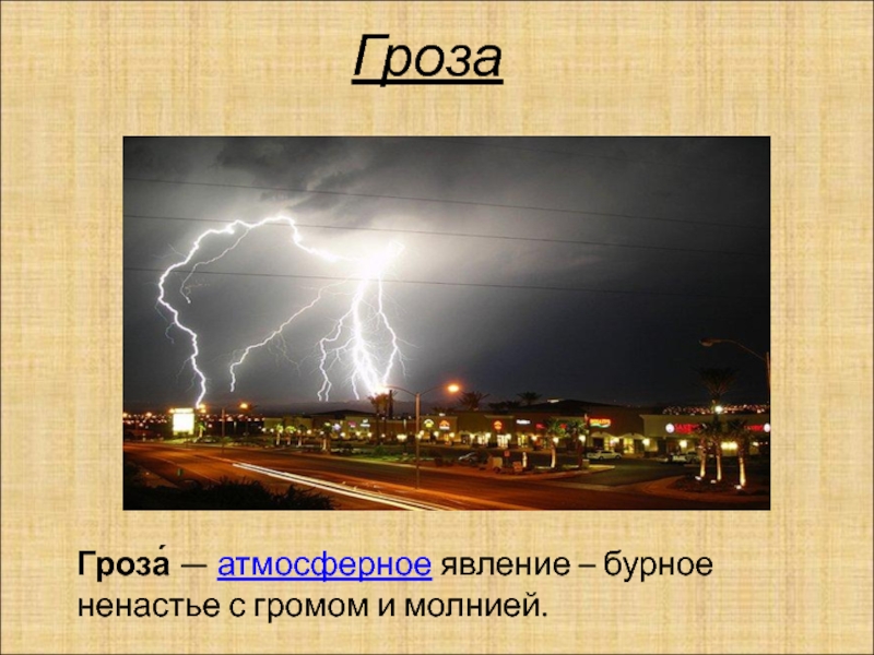 Гроза́ — атмосферное явление – бурное ненастье с громом и молнией.