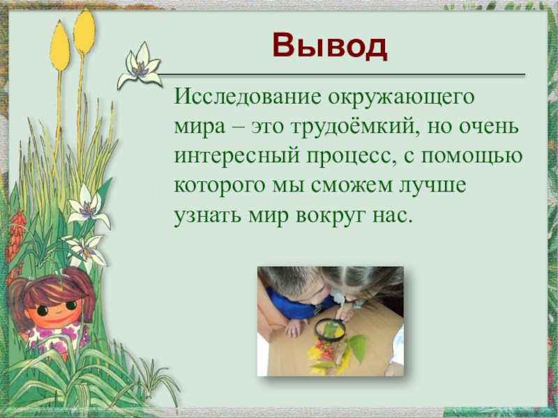 Вывод Исследование окружающего мира – это трудоёмкий, но очень интересный процесс, с помощью которого мы сможем лучше