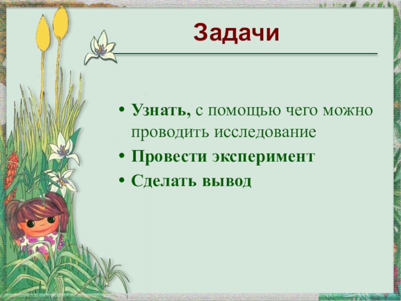 Задачи  Узнать, с помощью чего можно проводить исследованиеПровести экспериментСделать вывод