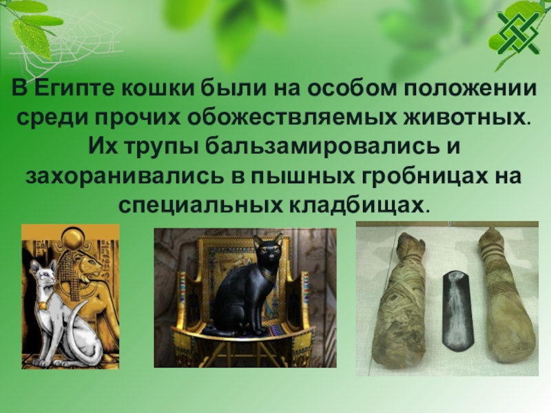 Слайд 10В Египте кошки были на особом положении среди прочих обожествляемых животных.