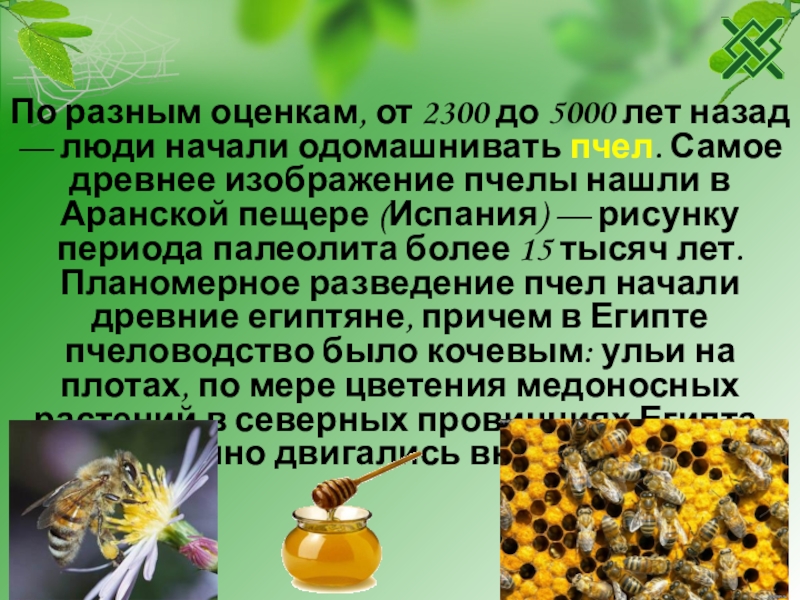 начали одомашнивать пчел. Самое древнее изображение пчелы нашли в Аранской пещере (Испания) — рисунку периода палеолита более 15 тысяч лет. Планомерное разведение пчел начали древние египтяне, причем в Египте пчеловодство было кочевым: ульи на плотах, по мере цветения медоносных растений в северных провинциях Египта, медленно двигались вниз по Нилу.