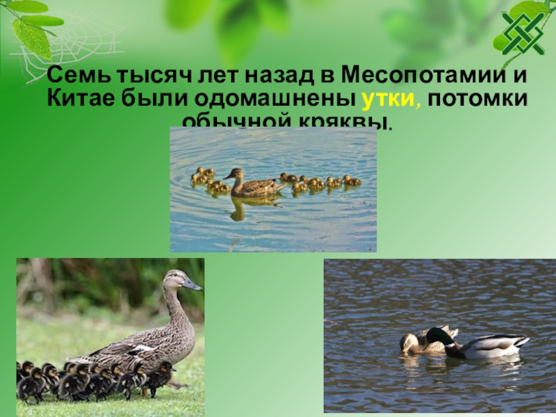 Слайд 13Семь тысяч лет назад в Месопотамии и Китае были одомашнены утки,