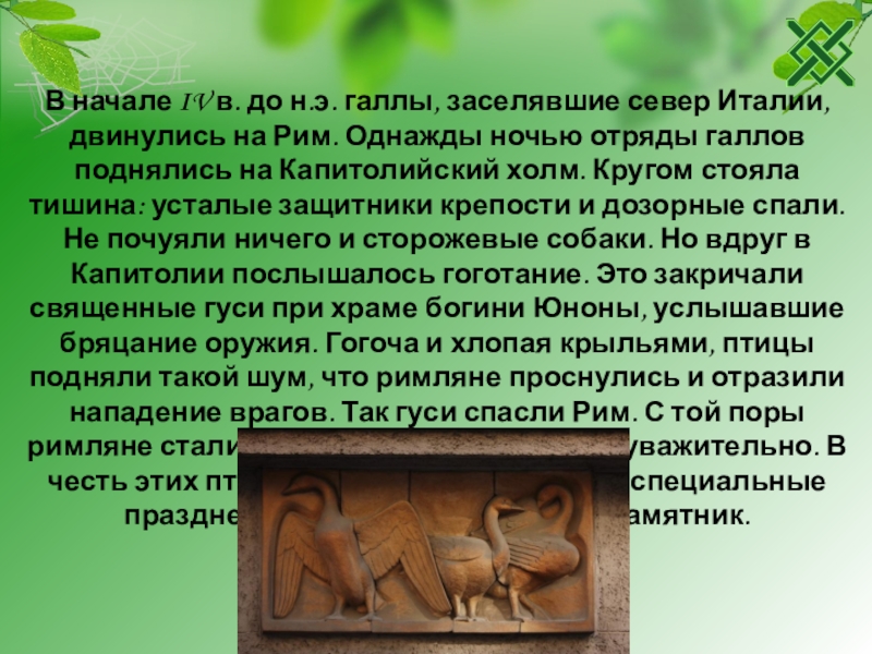 на Рим. Однажды ночью отряды галлов поднялись на Капитолийский холм. Кругом стояла тишина: усталые защитники крепости и дозорные спали. Не почуяли ничего и сторожевые собаки. Но вдруг в Капитолии послышалось гоготание. Это закричали священные гуси при храме богини Юноны, услышавшие бряцание оружия. Гогоча и хлопая крыльями, птицы подняли такой шум, что римляне проснулись и отразили нападение врагов. Так гуси спасли Рим. С той поры римляне стали относиться к гусям очень уважительно. В честь этих птиц они не только учредили специальные празднества, но и установили им памятник.
