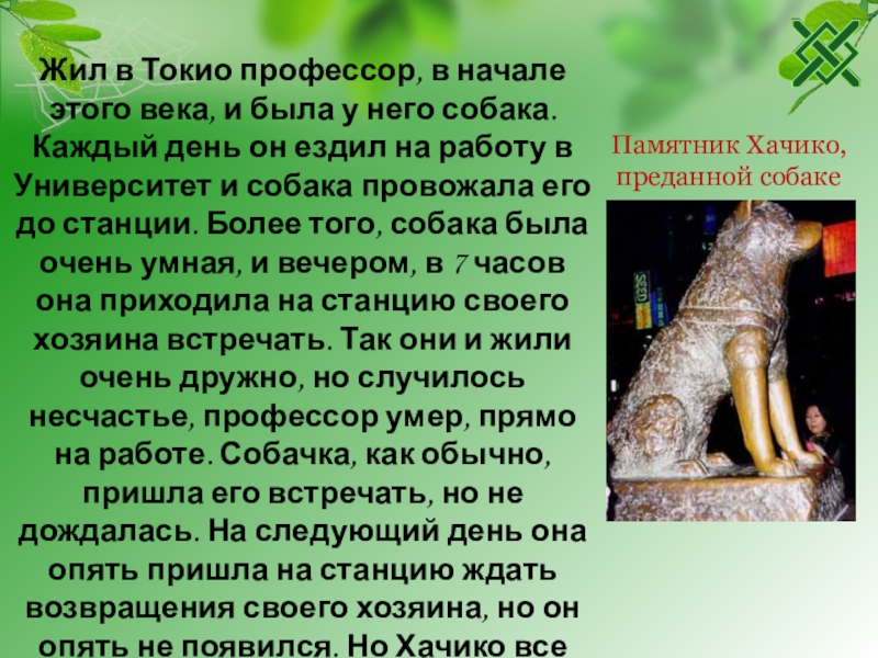 и была у него собака. Каждый день он ездил на работу в Университет и собака провожала его до станции. Более того, собака была очень умная, и вечером, в 7 часов она приходила на станцию своего хозяина встречать. Так они и жили очень дружно, но случилось несчастье, профессор умер, прямо на работе. Собачка, как обычно, пришла его встречать, но не дождалась. На следующий день она опять пришла на станцию ждать возвращения своего хозяина, но он опять не появился. Но Хачико все равно приходила на станцию в 7 часов и ждала своего хозяина, каждый день в течение последующих одиннадцати лет, до самой своей смерти.
