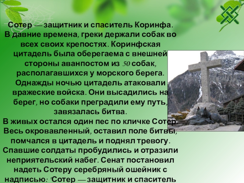 В живых остался один пес по кличке Сотер. Весь окровавленный, оставил поле битвы, помчался в цитадель и поднял тревогу. Спавшие солдаты пробудились и отразили неприятельский набег. Сенат постановил надеть Сотеру серебряный ошейник с надписью: "Сотер — защитник и спаситель Коринфа". В память о Сотере и сорока девяти собаках был воздвигнут памятник ещё в IV веке до нашей эры.