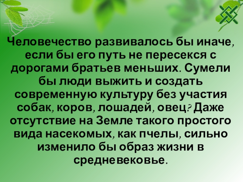дорогами братьев меньших. Сумели бы люди выжить и создать современную культуру без участия собак, коров, лошадей, овец? Даже отсутствие на Земле такого простого вида насекомых, как пчелы, сильно изменило бы образ жизни в средневековье.