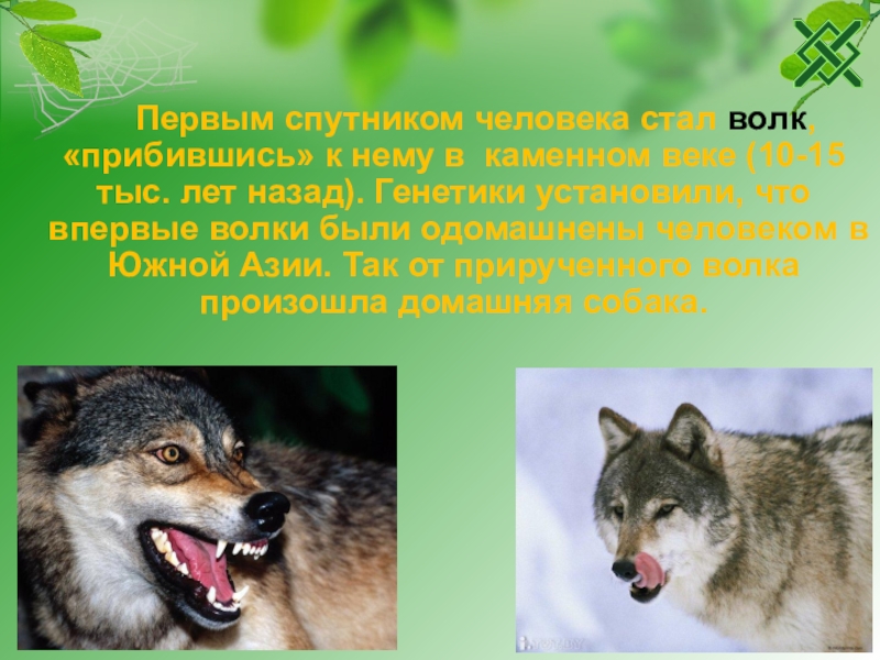 Слайд 3 Первым спутником человека стал волк, «прибившись» к