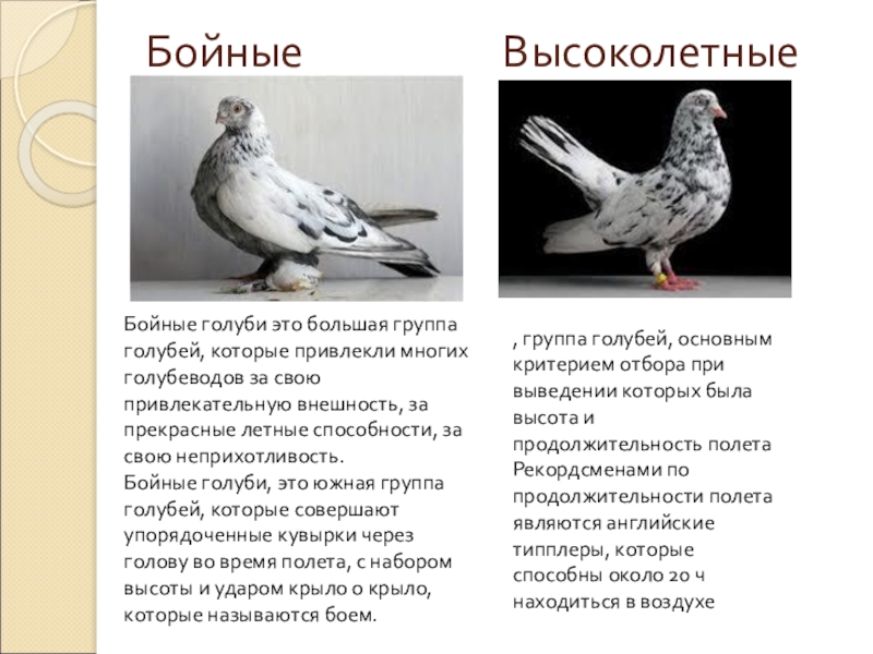 Бойные голуби это большая группа голубей, которые привлекли многих голубеводов за свою привлекательную внешность, за прекрасные летные способности, за свою неприхотливость.