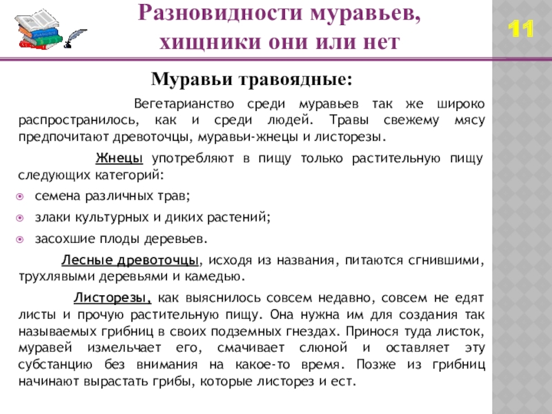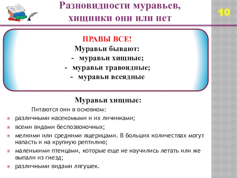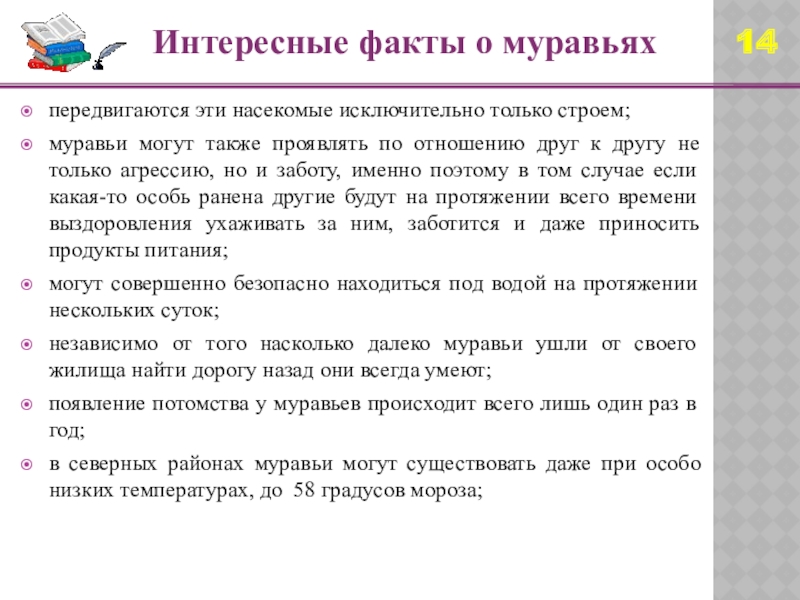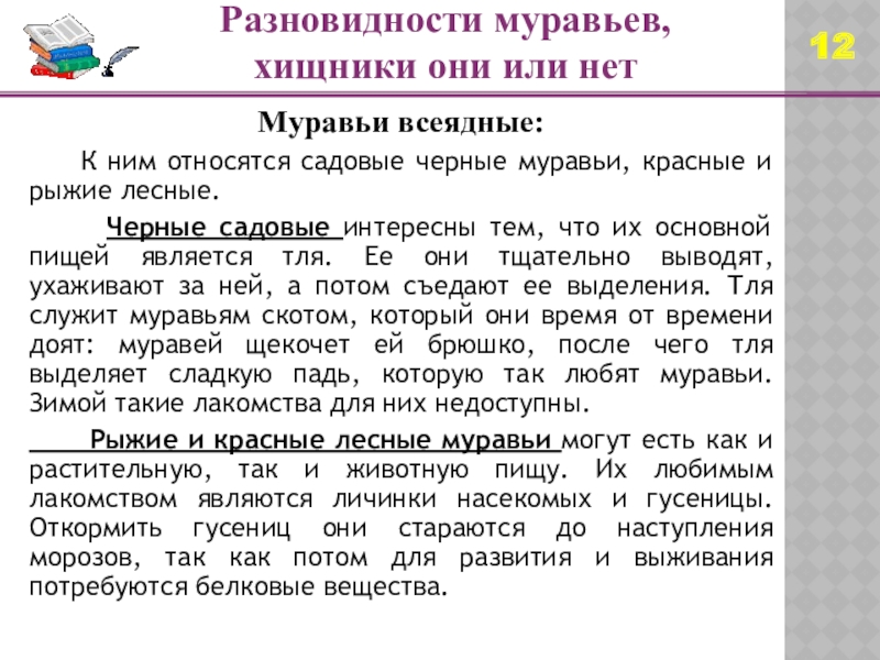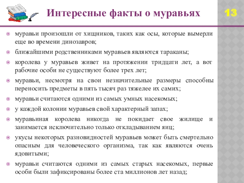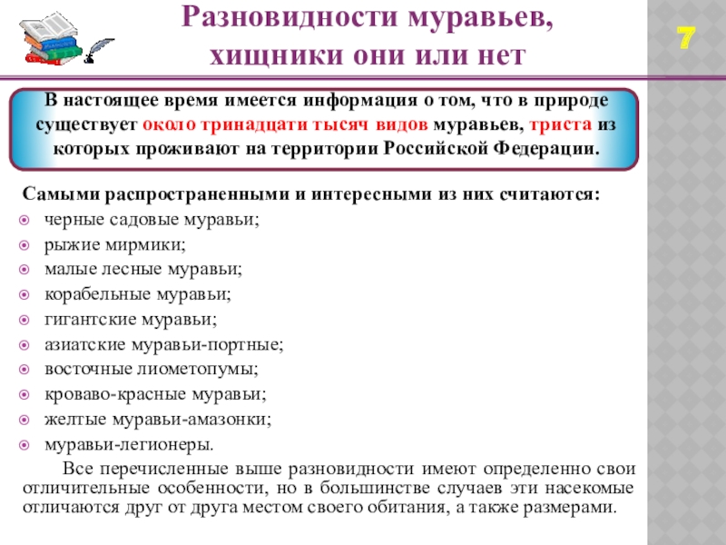 В настоящее время имеется информация о том, что в природе существует около тринадцати тысяч видов муравьев, триста из которых проживают на территории Российской Федерации.