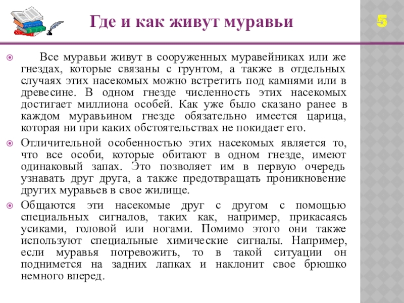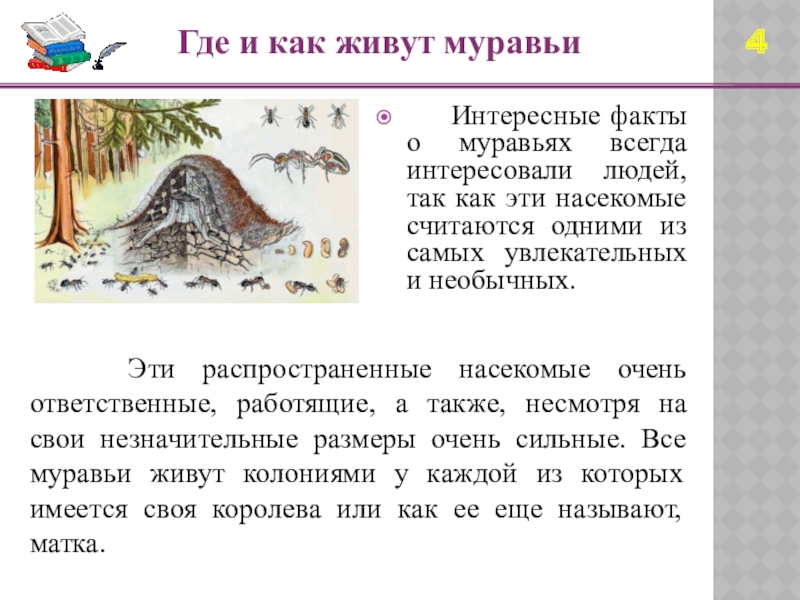 Эти распространенные насекомые очень ответственные, работящие, а также, несмотря на свои незначительные размеры очень сильные. Все муравьи живут колониями у каждой из которых имеется своя королева или как ее еще называют, матка.