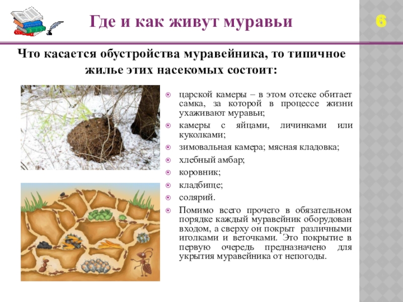 Что касается обустройства муравейника, то типичное жилье этих насекомых состоит: