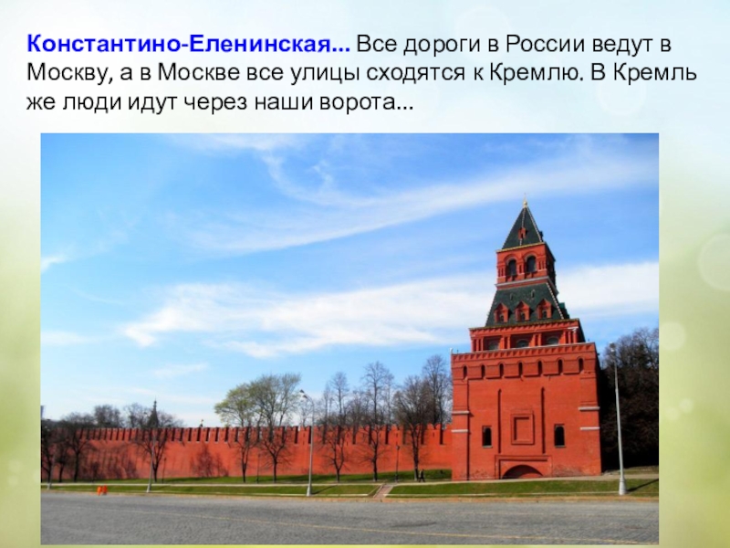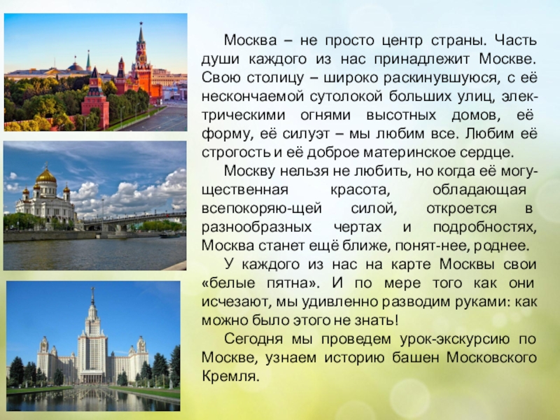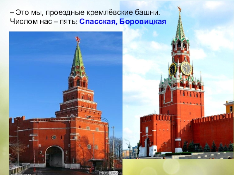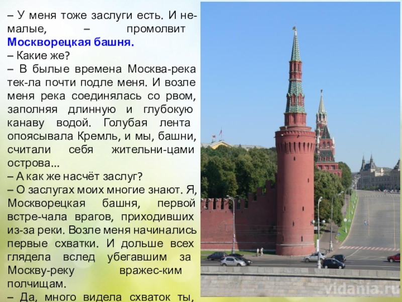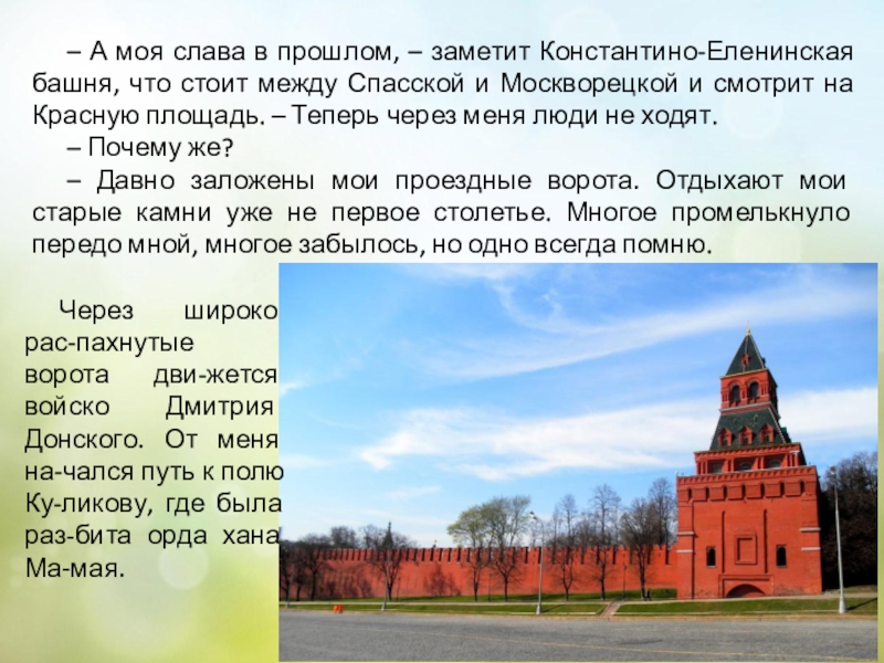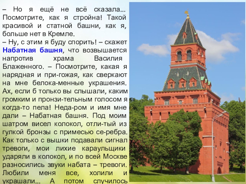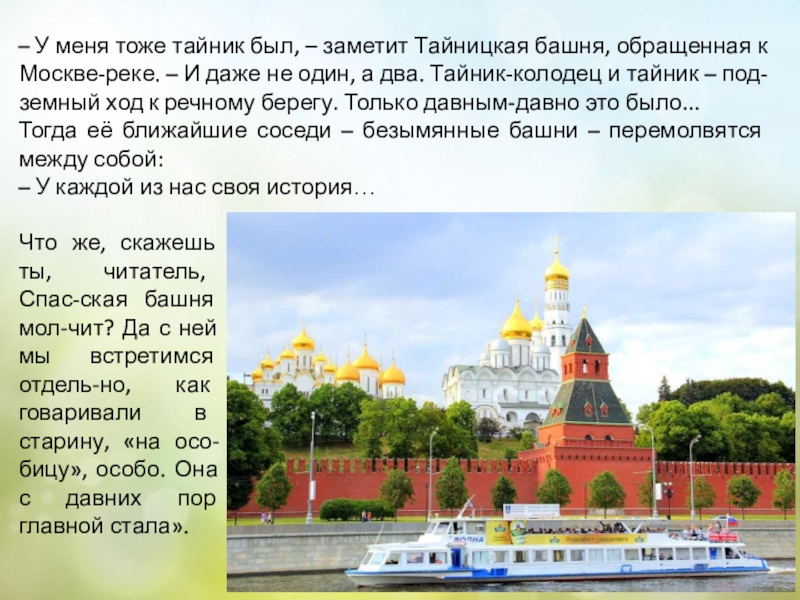 Что же, скажешь ты, читатель, Спас-ская башня мол-чит? Да с ней мы встретимся отдель-но, как говаривали в старину, «на осо-бицу», особо. Она с давних пор главной стала».
