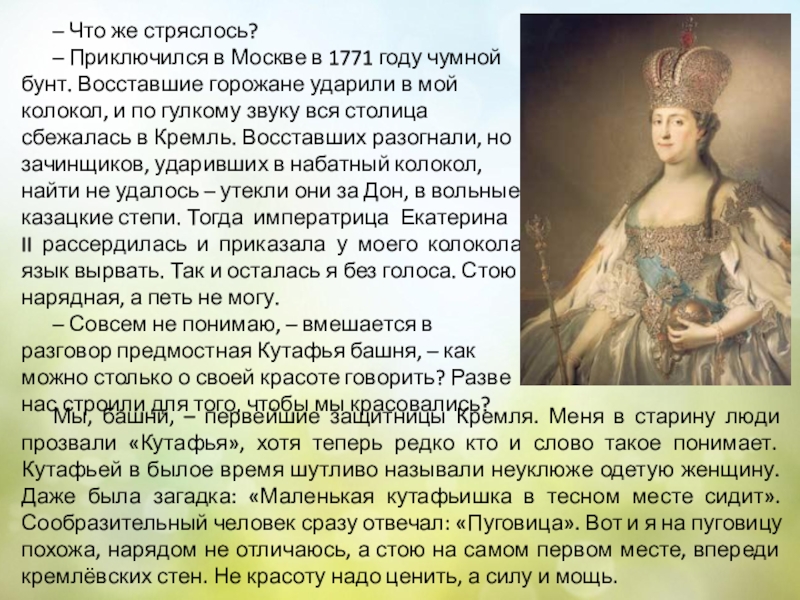Мы, башни, – первейшие защитницы Кремля. Меня в старину люди прозвали «Кутафья», хотя теперь редко кто и слово такое понимает. Кутафьей в былое время шутливо называли неуклюже одетую женщину. Даже была загадка: «Маленькая кутафьишка в тесном месте сидит». Сообразительный человек сразу отвечал: «Пуговица». Вот и я на пуговицу похожа, нарядом не отличаюсь, а стою на самом первом месте, впереди кремлёвских стен. Не красоту надо ценить, а силу и мощь.