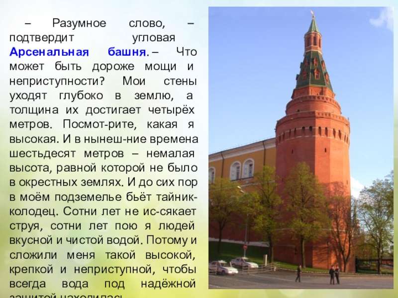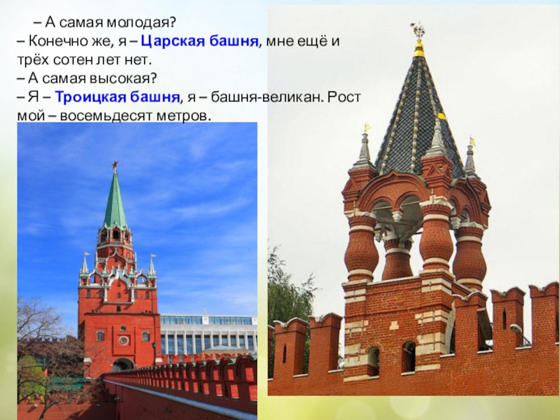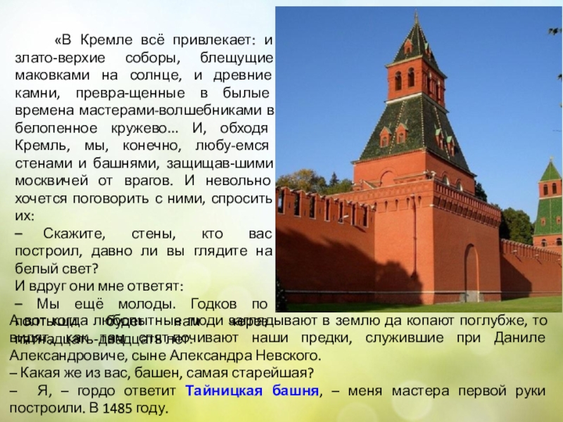 – Я, – гордо ответит Тайницкая башня, – меня мастера первой руки построили. В 1485 году.
