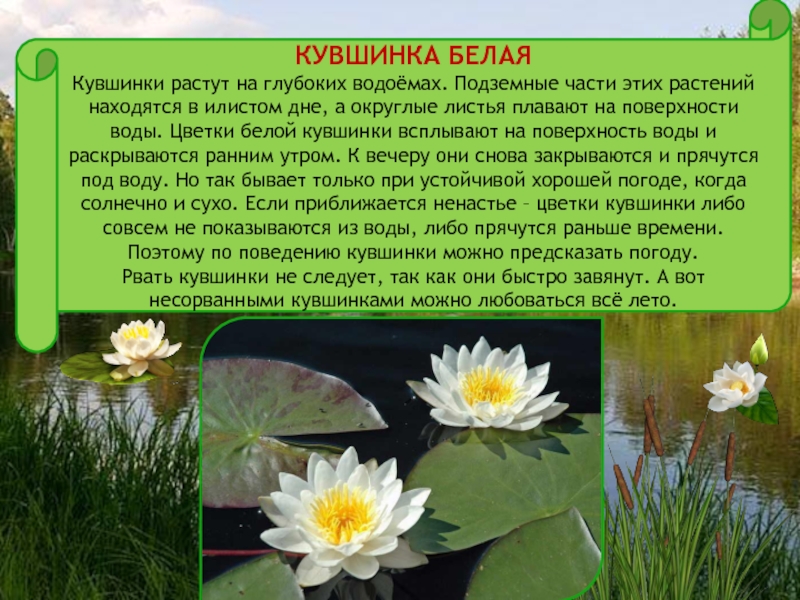 в илистом дне, а округлые листья плавают на поверхности воды. Цветки белой кувшинки всплывают на поверхность воды и раскрываются ранним утром. К вечеру они снова закрываются и прячутся под воду. Но так бывает только при устойчивой хорошей погоде, когда солнечно и сухо. Если приближается ненастье – цветки кувшинки либо совсем не показываются из воды, либо прячутся раньше времени. Поэтому по поведению кувшинки можно предсказать погоду.