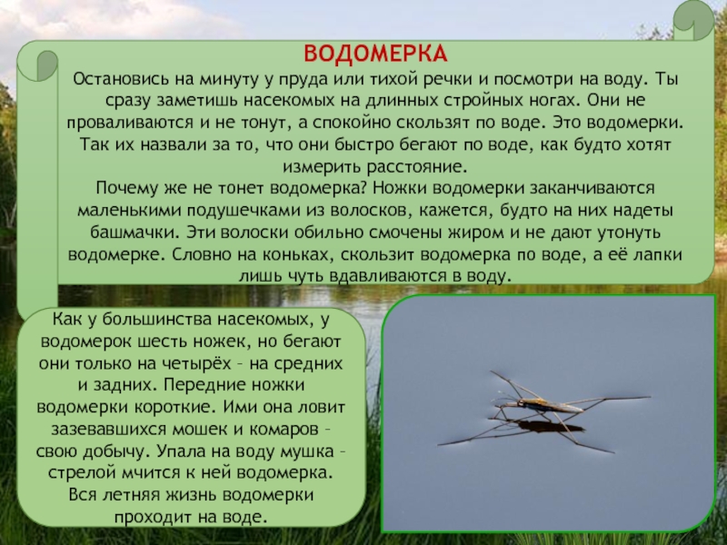 воду. Ты сразу заметишь насекомых на длинных стройных ногах. Они не проваливаются и не тонут, а спокойно скользят по воде. Это водомерки. Так их назвали за то, что они быстро бегают по воде, как будто хотят измерить расстояние.