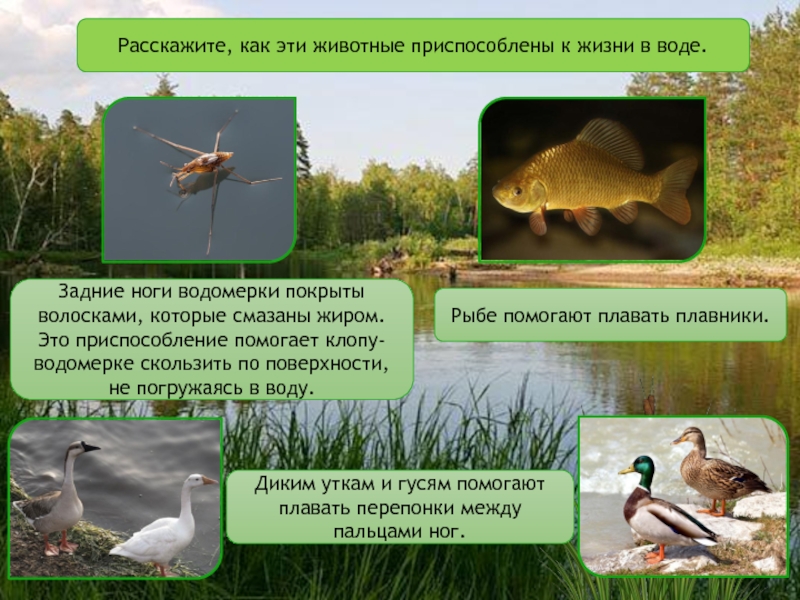 Слайд 20Расскажите, как эти животные приспособлены к жизни в воде.