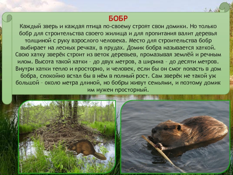 бобр для строительства своего жилища и для пропитания валит деревья толщиной с руку взрослого человека. Место для строительства бобр выбирает на лесных речках, в прудах. Домик бобра называется хаткой. Свою хатку зверёк строит из веток деревьев, промазывая землёй и речным илом. Высота такой хатки – до двух метров, а ширина – до десяти метров. Внутри хатки тепло и просторно, и человек, если бы он смог попасть в дом бобра, спокойно встал бы в нём в полный рост. Сам зверёк не такой уж большой – около метра длиной, но бобры живут семьями, и поэтому домик им нужен просторный.