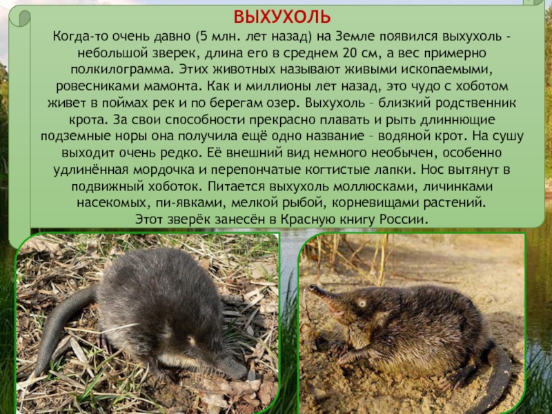 - небольшой зверек, длина его в среднем 20 см, а вес примерно полкилограмма. Этих животных называют живыми ископаемыми, ровесниками мамонта. Как и миллионы лет назад, это чудо с хоботом живет в поймах рек и по берегам озер. Выхухоль – близкий родственник крота. За свои способности прекрасно плавать и рыть длиннющие подземные норы она получила ещё одно название – водяной крот. На сушу выходит очень редко. Её внешний вид немного необычен, особенно удлинённая мордочка и перепончатые когтистые лапки. Нос вытянут в подвижный хоботок. Питается выхухоль моллюсками, личинками насекомых, пи-явками, мелкой рыбой, корневищами растений.