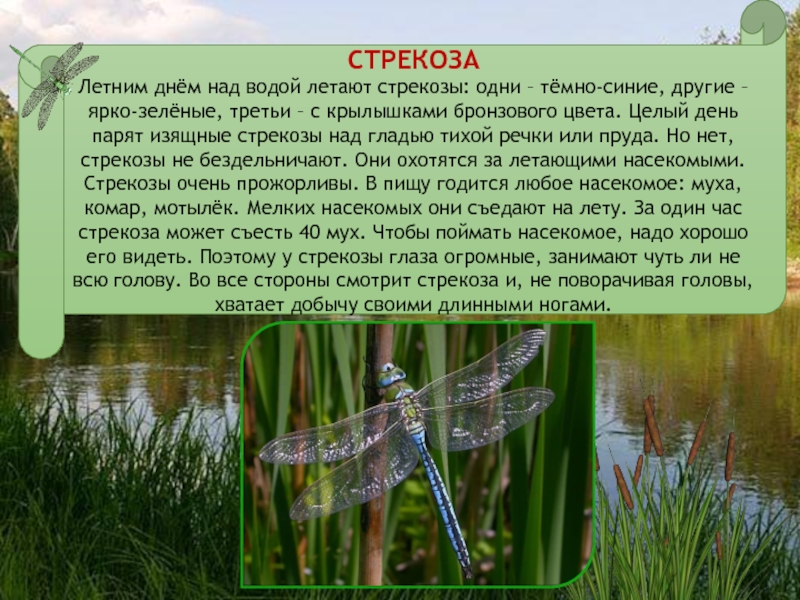ярко-зелёные, третьи – с крылышками бронзового цвета. Целый день парят изящные стрекозы над гладью тихой речки или пруда. Но нет, стрекозы не бездельничают. Они охотятся за летающими насекомыми. Стрекозы очень прожорливы. В пищу годится любое насекомое: муха, комар, мотылёк. Мелких насекомых они съедают на лету. За один час стрекоза может съесть 40 мух. Чтобы поймать насекомое, надо хорошо его видеть. Поэтому у стрекозы глаза огромные, занимают чуть ли не всю голову. Во все стороны смотрит стрекоза и, не поворачивая головы, хватает добычу своими длинными ногами.
