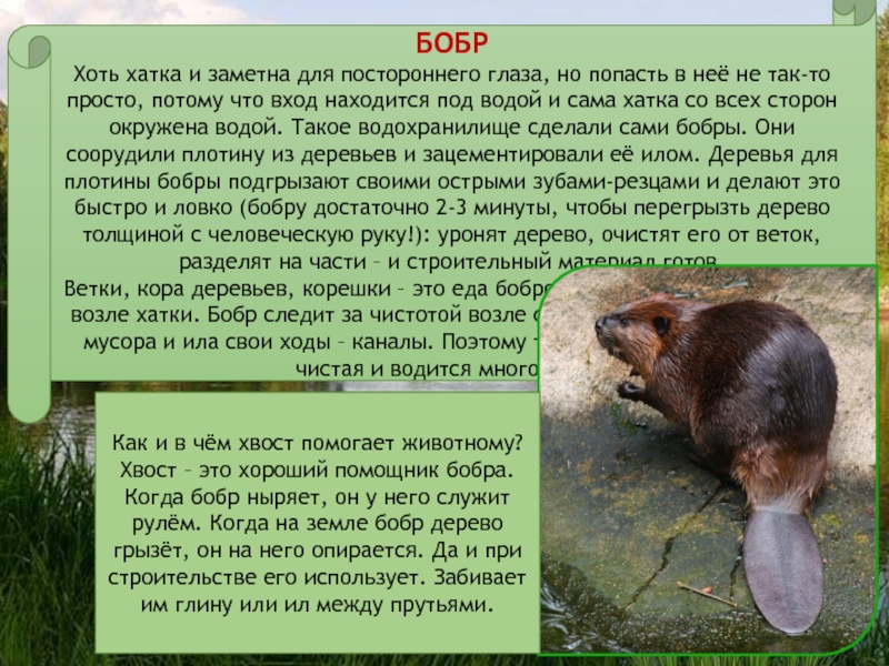Хвост – это хороший помощник бобра. Когда бобр ныряет, он у него служит рулём. Когда на земле бобр дерево грызёт, он на него опирается. Да и при строительстве его использует. Забивает им глину или ил между прутьями.