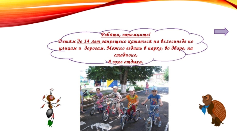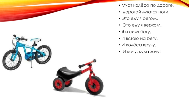 Мчат колёса по дороге, дорогой мчатся ноги. Это еду я бегом, Это еду я верхом! Я и сидя бегу, И встаю на бегу, И колёса кручу, И качу, куда хочу!