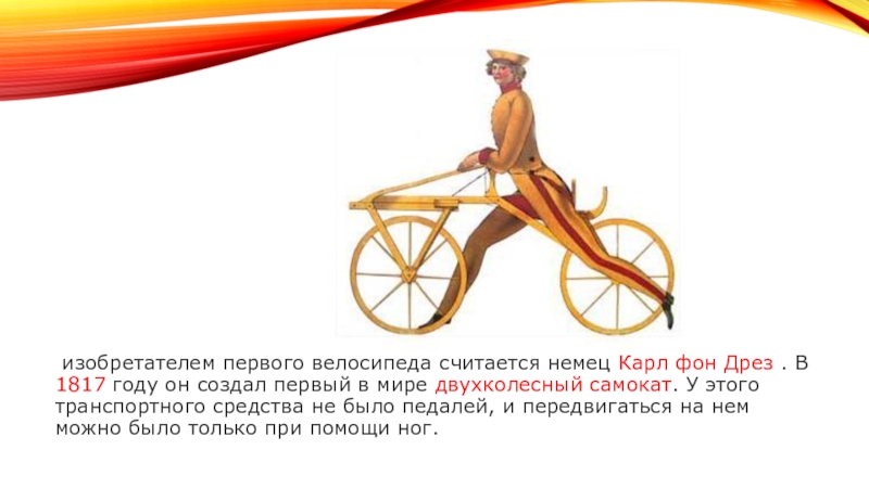 Слайд 5 изобретателем первого велосипеда считается немец Карл фон Дрез . В