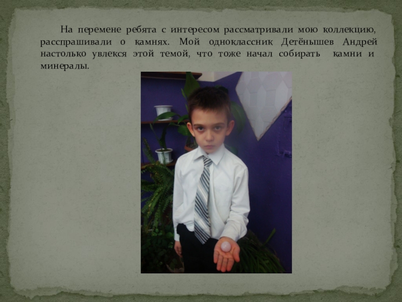 Мой одноклассник Детёнышев Андрей настолько увлекся этой темой, что тоже начал собирать камни и минералы.