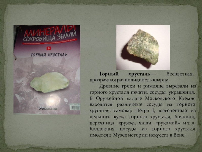 Слайд 10Горный хрусталь — бесцветная, прозрачная разновидность кварца.