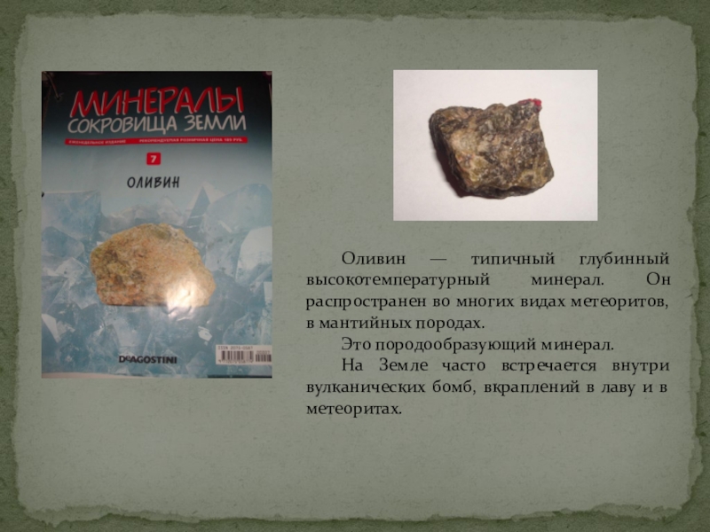 Слайд 8Оливин — типичный глубинный высокотемпературный минерал. Он распространен во многих видах